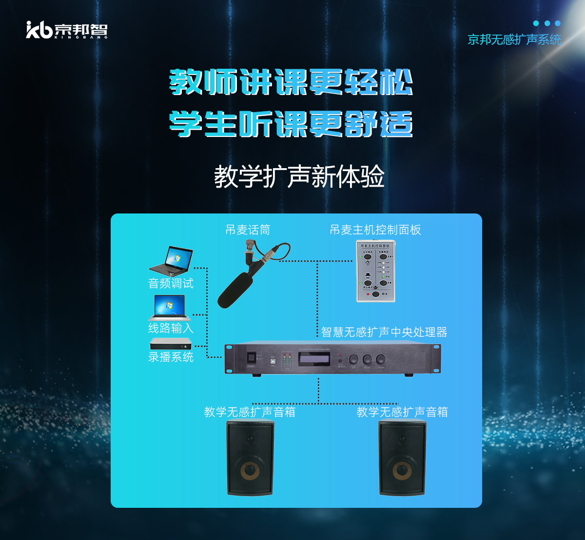 京邦無感擴(kuò)聲系統(tǒng)作為新一代無感擴(kuò)聲解決方案,內(nèi)置多種智能音頻算法,支持嘯叫抑制,混響抑制,智能降噪及自動增益控制 ,同時實(shí)現(xiàn)語音增強(qiáng),在嘈雜環(huán)境下也可以實(shí)現(xiàn)智能無感高保真拾音與擴(kuò)聲。